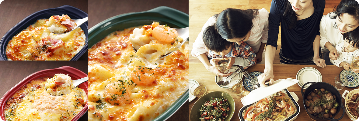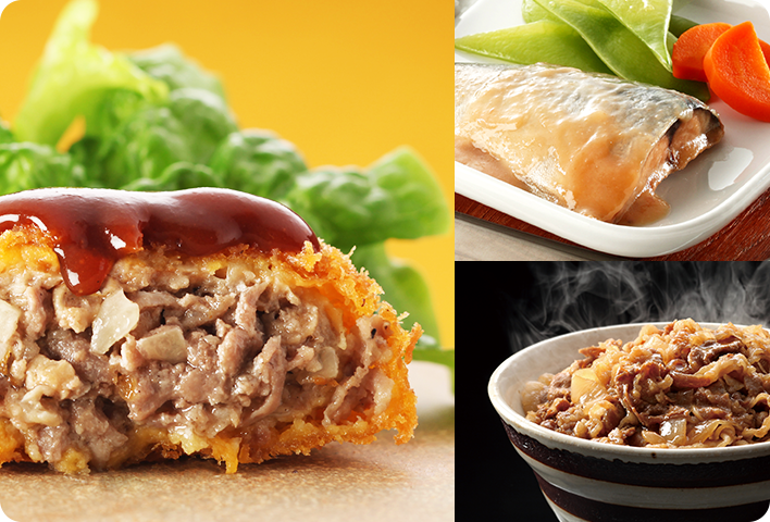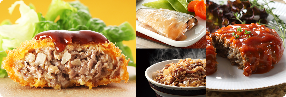当社の商品は、メンチカツ、コロッケ、ハンバーグなどの主力商品に加え、グラタン、パスタ、餃子、丼の具、デザートなど多岐にわたります。