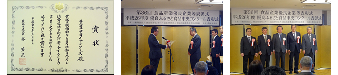 お知らせ 2015.03.11 第36回食品産業優良企業等表彰において、『農林水産大臣賞』を受賞いたしました。