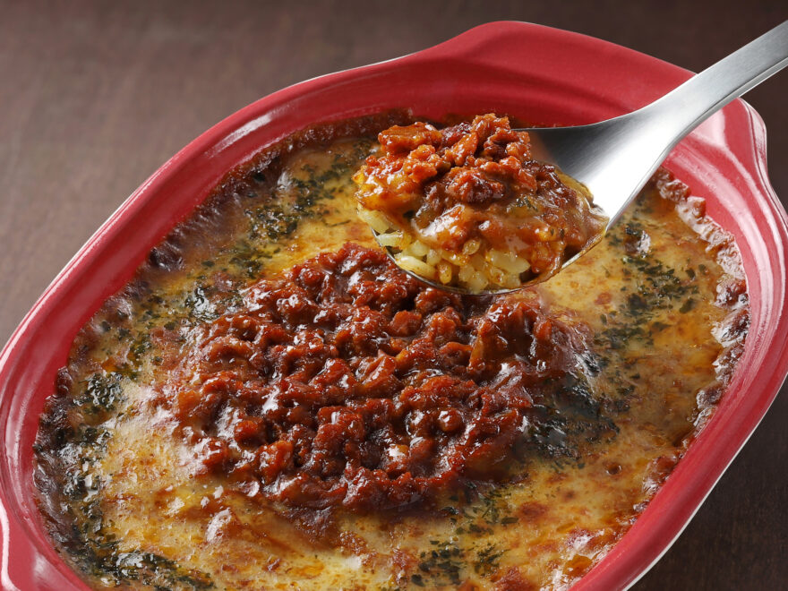 押し麦入りのターメリックライスに、カレーをトッピングし焼き上げました。ベーシックなルーとスパイシーなキーマカレー風、2種類のカレーを組み合わせ深みのある味に仕上げています。