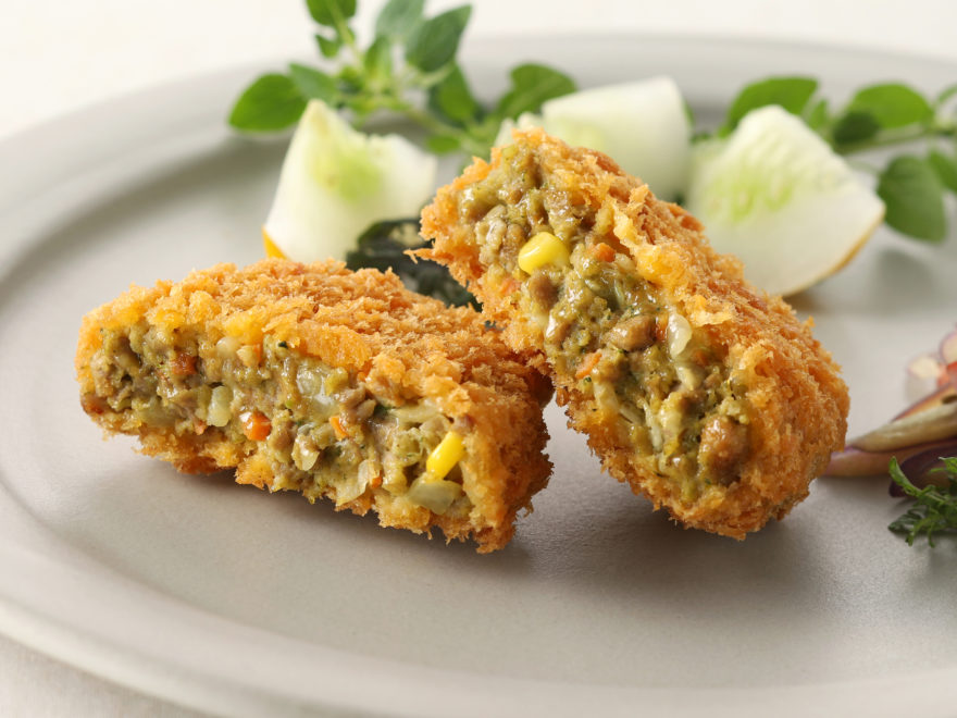 お肉の代わりに大豆たんぱくから作った“大豆ミート”ベースの生地に、野菜(キャベツ・タマネギ・コーン・人参・ホウレン草)を混ぜ込んだメンチカツです。香ばしく甘みのある生地を、米粉入りのパン粉で包みました。