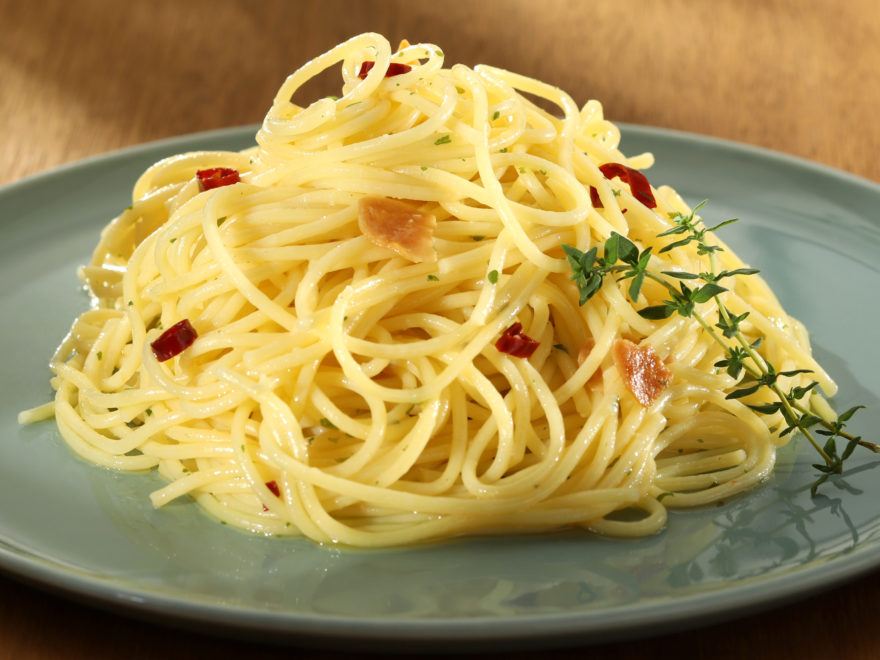 香ばしいガーリックの風味とオリーブオイルの香りが際立つシンプルなスパゲティです。 輪切りの赤唐辛子・パセリ粉が彩りを華やかに。