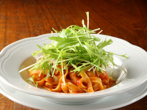 濃い目のトマトクリームソースをさっぱりとした後味にする、とても簡単なアレンジです。 よく混ぜてから召し上がっていただくと、パスタの余熱で水菜がしんなりし、ちょうどよい食感になります。