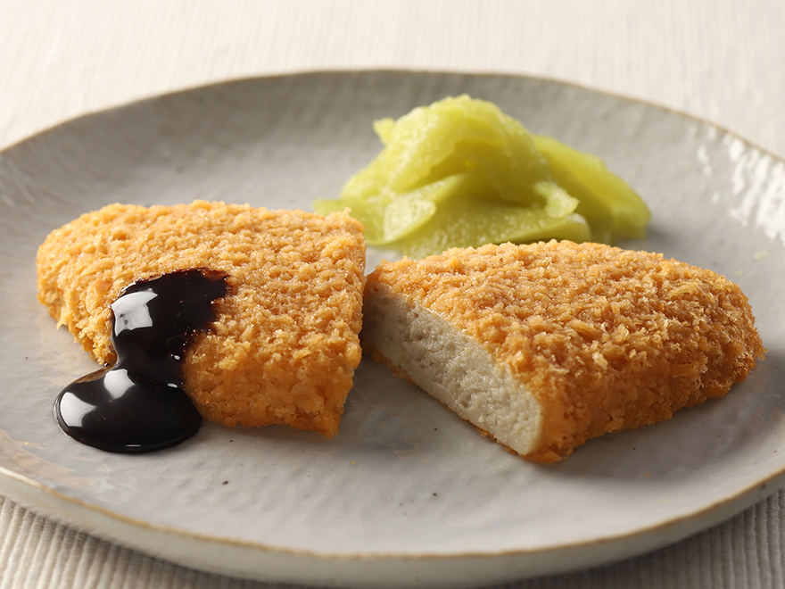 ふっくらとした食感のアジフライをイメージしたムースです。アジの切り身(半身)の形状にこだわりました。