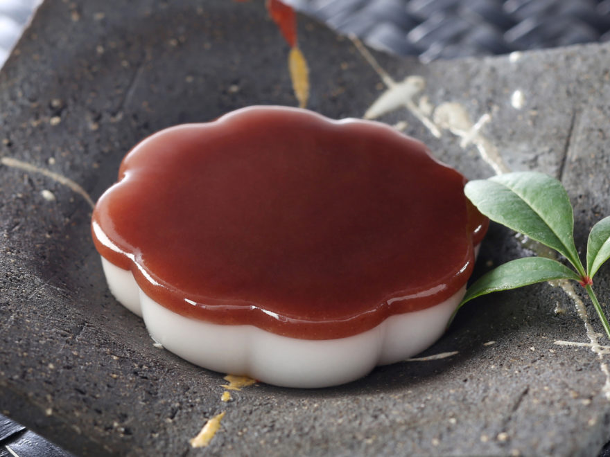 和菓子のあんころ餅をイメージしたカップデザートです。下層のゼリーにはもち粉を加え、お餅の風味を出しました。素朴な甘さのこしあんソースと合わせた一品です。