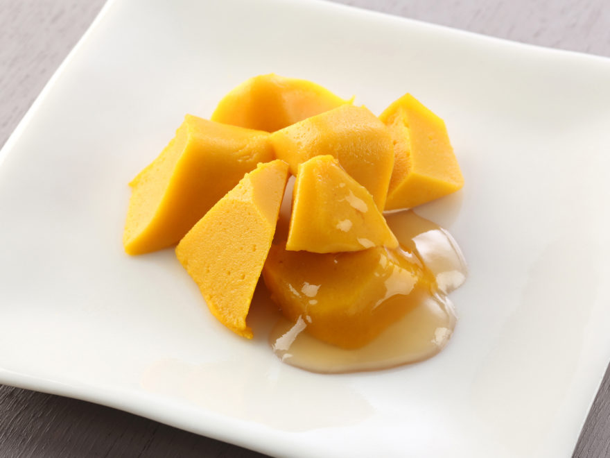 カットの工夫で様々なメニューに活用できるブロックタイプの野菜ムースです。カボチャの風味と彩り、しっとりとした舌触りも再現しています。