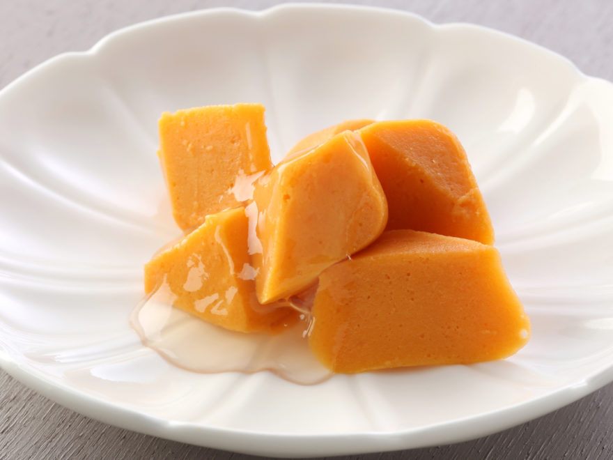 カットの工夫で様々なメニューに活用できるブロックタイプの野菜ムースです。ニンジンの風味と彩りを再現しています。