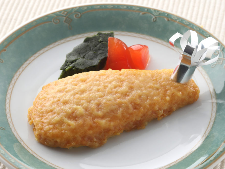なめらかな食感の鶏肉ムースに、フライドチキン風味のやわらかな衣をつけました。普段のおかずやクリスマスなどの催事メニューにご利用ください。
