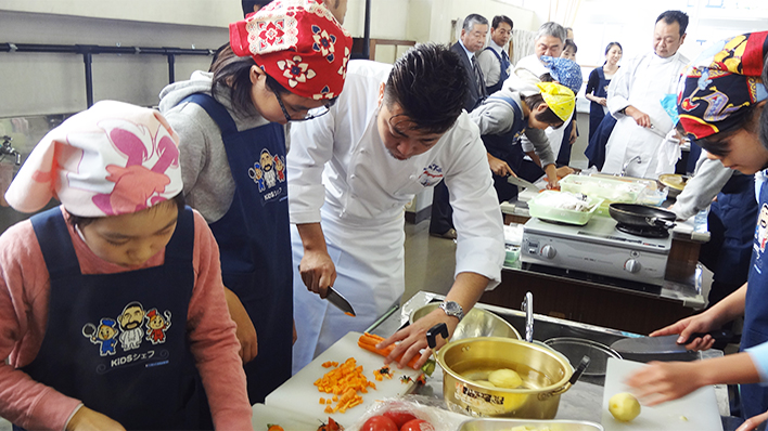 KIDS-シェフが決まった学校は、約1年前から自分たちの生活エリアでは、どういう食材が採れるのか、どのような食文化が有るのかを学んでいただきます。また、地元生産者の訪問や、工場見学、自分たちで作物を育てる等を通じて、食材が生まれる背景もしっかり勉強してもらいます。KIDS-シェフは一過性の料理の実習ではありません。当日は味覚の授業(五味:甘味、酸味、塩味、苦味、うま味)を受けた後、調理がスタートします。