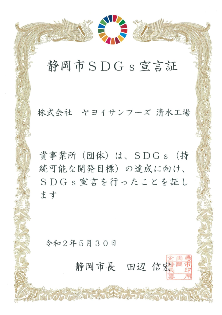 清水工場のある静岡市は、「SDGs未来都市」に選ばれており、その取り組みの一つとして「SDGs宣言」事業を実施しています。
